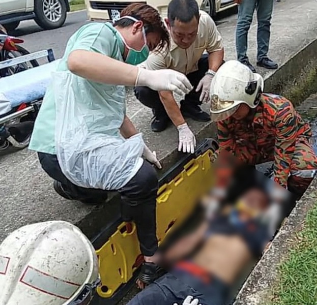 罗东国油油站(Petronas Lutong)附近路段于4日中午惊传意外!一名26岁年轻骑士在骑行途中突然失控翻车,整个人连同摩托车齐齐摔进路旁深沟,因身体受困导致动弹不得,场面一度惊险。