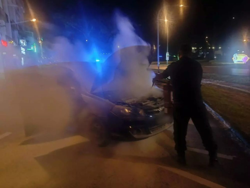 当时,巡逻警员在巡经某商店前的停车位时,发现一辆宝腾赛佳(Proton Saga)轿车情况异常,不仅车头冒出滚滚浓烟,车底甚至已窜出火苗,局势刻不容缓。