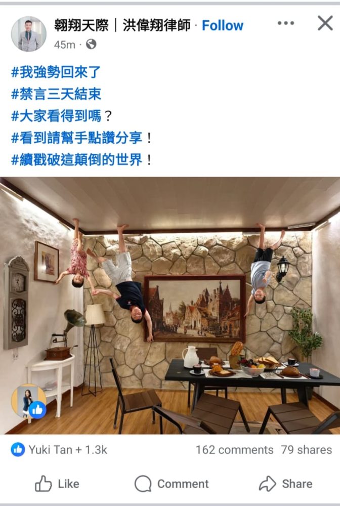 网红律师洪伟翔新设立的脸书专页,在上线不久后即遭平台限制发文,不过有关限制如今已解除。他周五通过该新专页发文,宣布自己结束3天禁言状态,重新恢复发声。