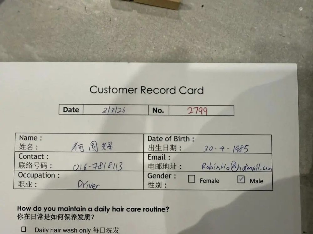 按照发廊的惯例,每位顾客在接受服务前都需要填写基本资料,以方便日后查询消费记录或在顾客遗留物品时能够联系对方。这名男子当时也照常填写资料,整个过程看起来并没有任何异常。