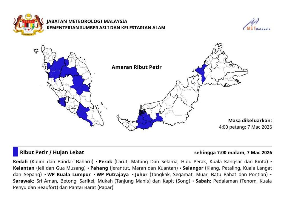 与此同时,东马方面也处于天气不稳定的状态。砂拉越的斯里阿曼、木中、泗里街、沐胶(丹绒马尼)以及加帛(桑)已被列入预警名单。在沙巴,雷雨云团则集中在内陆地区(丹南、瓜拉班尤及保佛)以及西海岸(吧巴)。