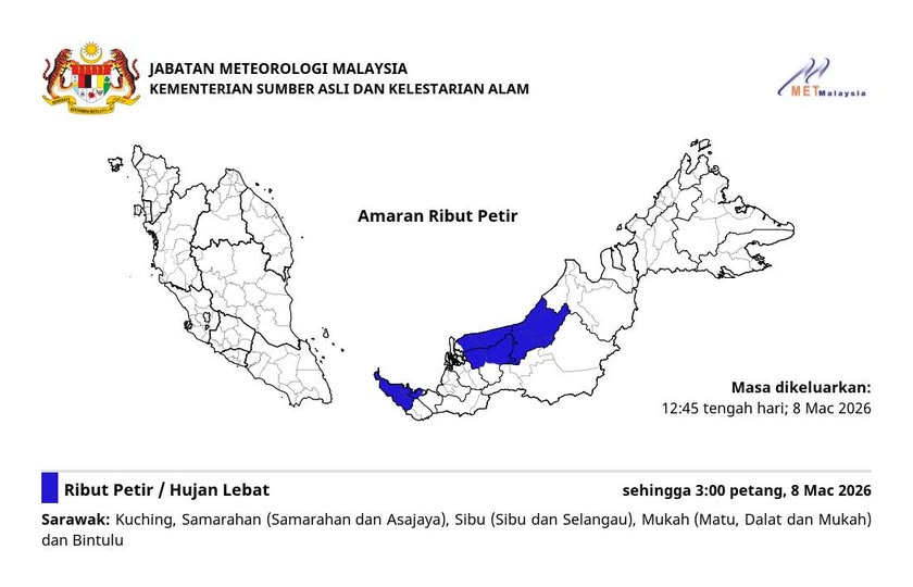 气象局发布天气警报指出,砂拉越多个地区预计出现雷雨、豪雨及强风天气,相关情况预计持续至今日(8日)下午3时。