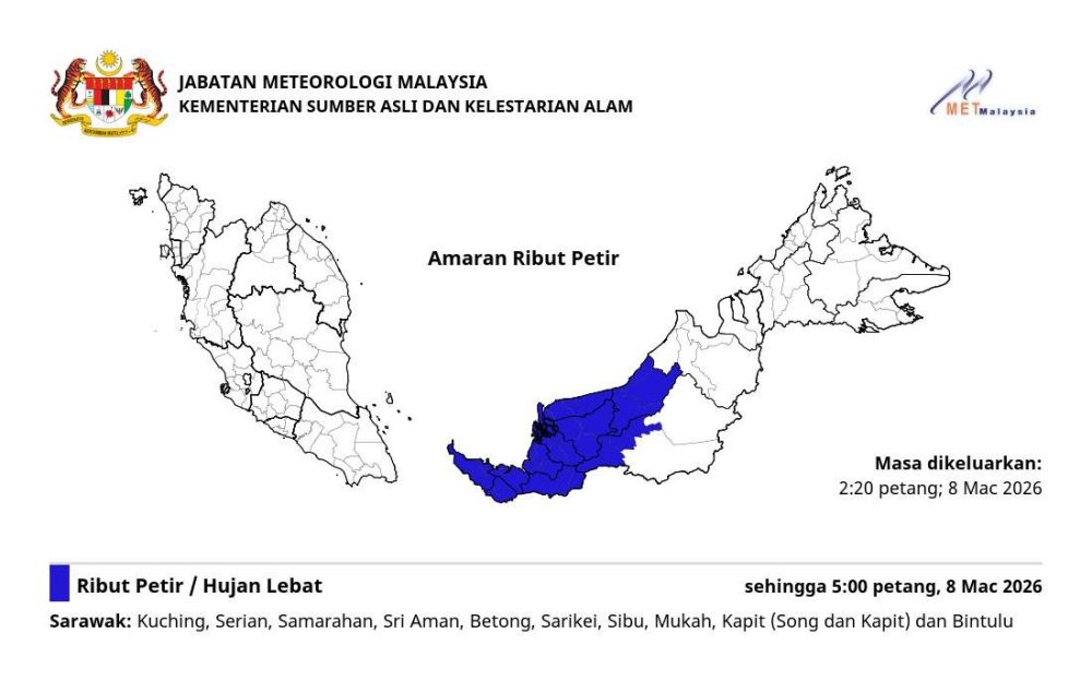 气象局针对砂拉越多个地区发布短期雷雨警报,预计大雨、强风及雷暴天气将持续至今日下午5时,民众受促提高警惕。