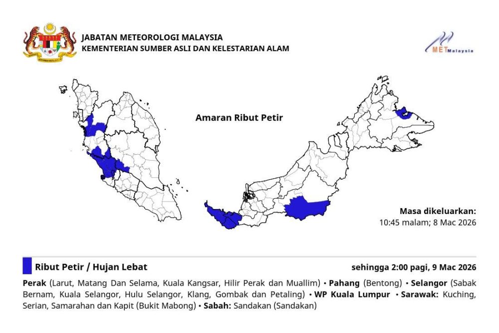 马来西亚气象局今晚10时45分发布最新雷雨警报,随着大气层不稳定,西马多个州属、吉隆坡直辖区及东马部分地区将迎来强降雨、雷电及强风,预计恶劣天气将持续至明日(9日)凌晨2时。