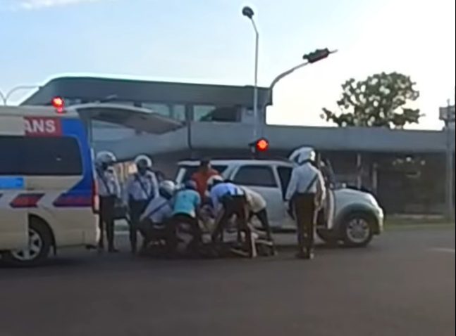 视频画面显示,一名交警当时正在十字路口指挥交通,一辆载有病患的白色休旅车,在另一批交警与民防部队巡逻车的护航下紧急抵达。几秒钟后,救护车也恰好赶到现场进行“汇合”。