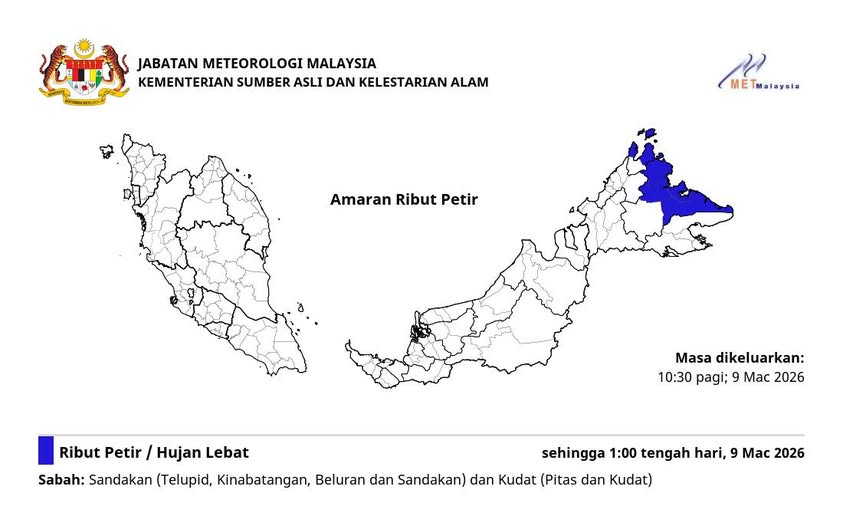 根据气象局发布的短期气象预报,受影响范围包括山打根(特鲁必、京那巴当岸、比鲁兰及山打根市区)以及古达(必达士及古达)。