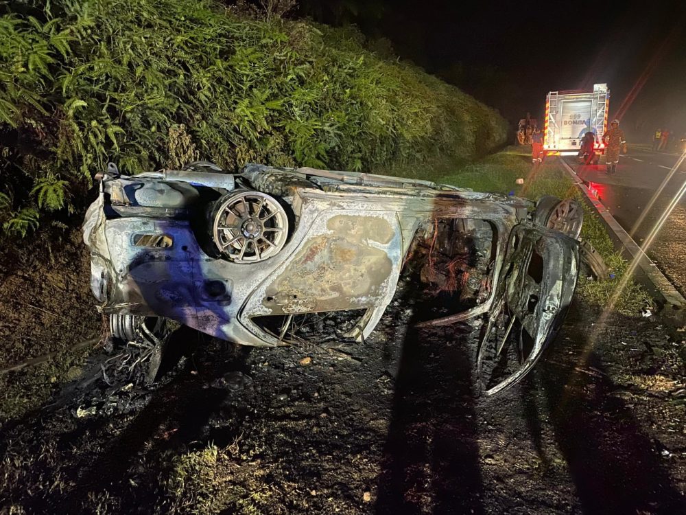 柔佛州消防与拯救局随后说明,失事轿车起火后烧毁程度约达80%。令金消拯局于凌晨12时37分接获投报后,联同东南镇消拯局赶往现场展开行动。救援队抵达时,车辆已陷入火海,消拯员随即扑灭火势,并全面检查现场,以确认没有其他人受困车内。