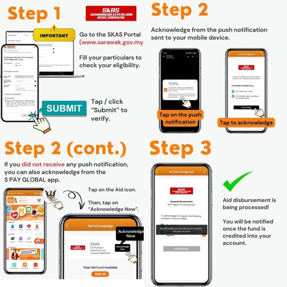 完成账户设置后,用户需在应用程式中进入带有“犀鸟”图标的Aid Wallet页面,并点击“Acknowledge”(确认)按钮。这个步骤是系统启动援助金发放程序的重要环节,若未点击确认,即使已经符合资格,系统也不会继续处理拨款。有些人即使没有收到应用程式推送通知,也可以自行打开S Pay Global,在Aid图标内找到SKAS并点击“Acknowledge Now”完成确认。
