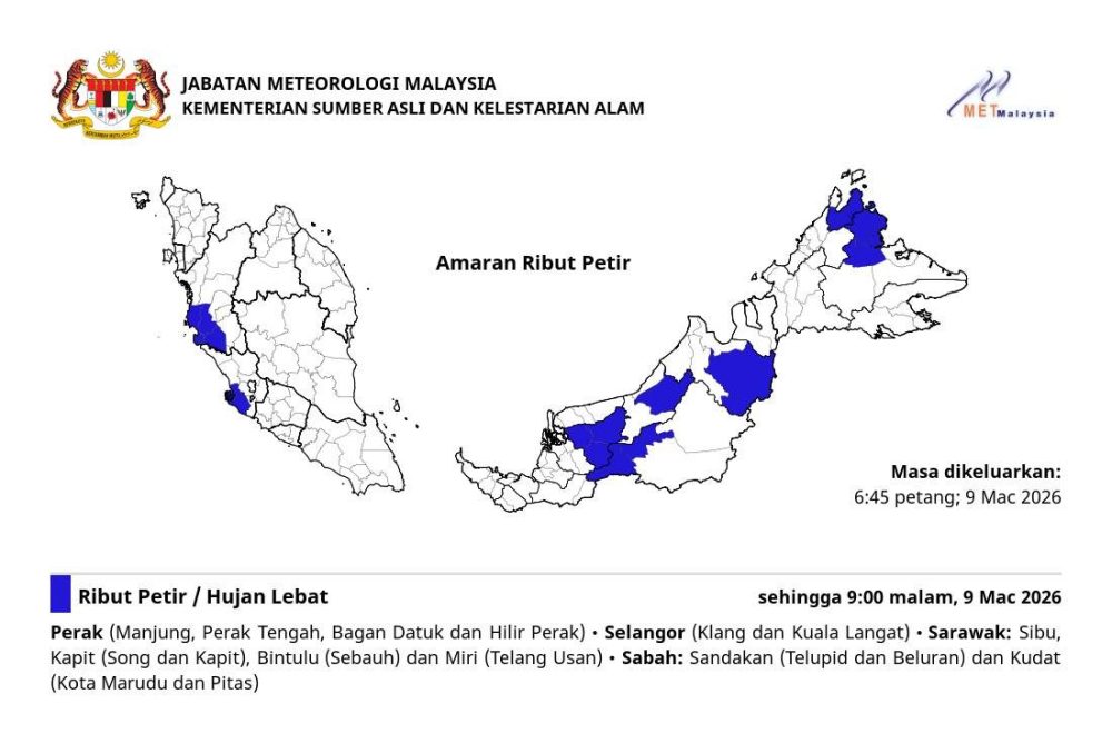 马来西亚气象局于今日(3月9日)傍晚6时45分再度发布紧急雷雨预警,鉴于大气条件极不稳定,我国多个地区预计将迎来强降雨、雷电及强风,恶劣天气预计将持续至今日晚间9时。