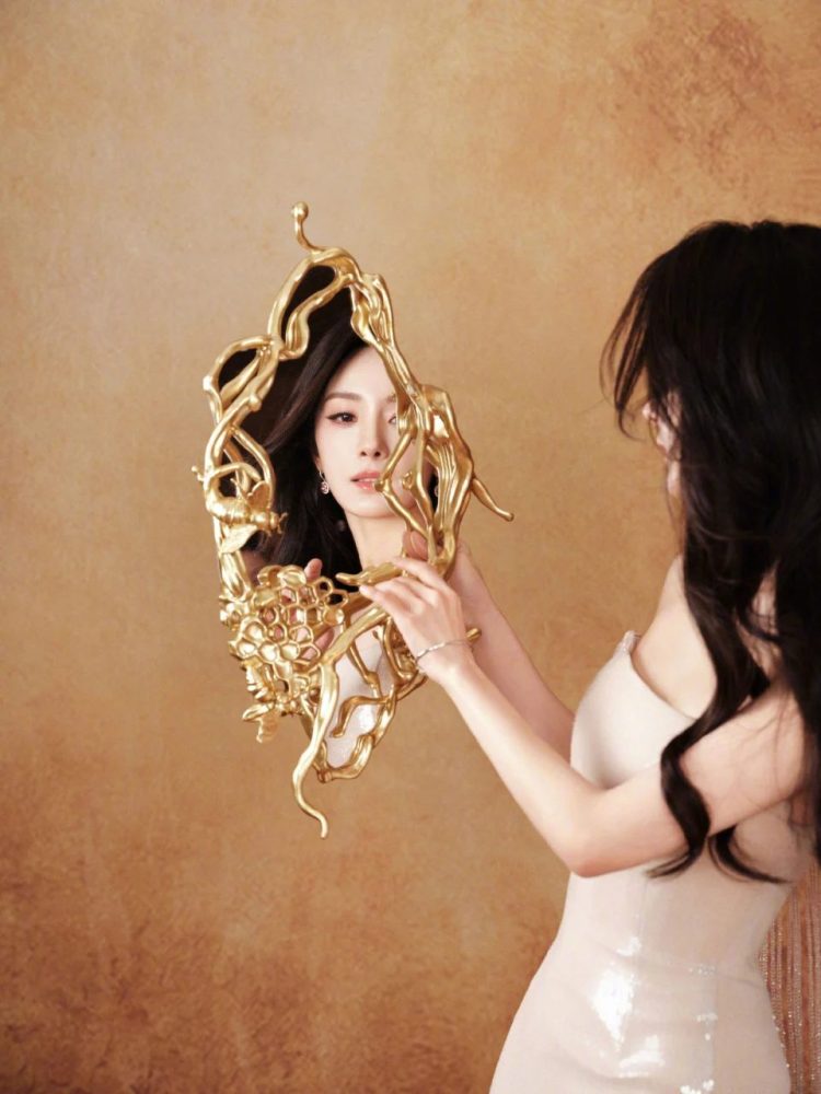 7日,她在三亚出席品牌活动时,以闪片露肩礼服搭配一头波浪长发亮相,整体造型高贵优雅。活动现场以“釉光玫瑰”为主题,而她身后巨大的香槟色花朵背景意外与发型形成巧妙错位效果,花瓣与发丝在视觉上交织,仿佛披上一层轻盈的“天然头纱”。