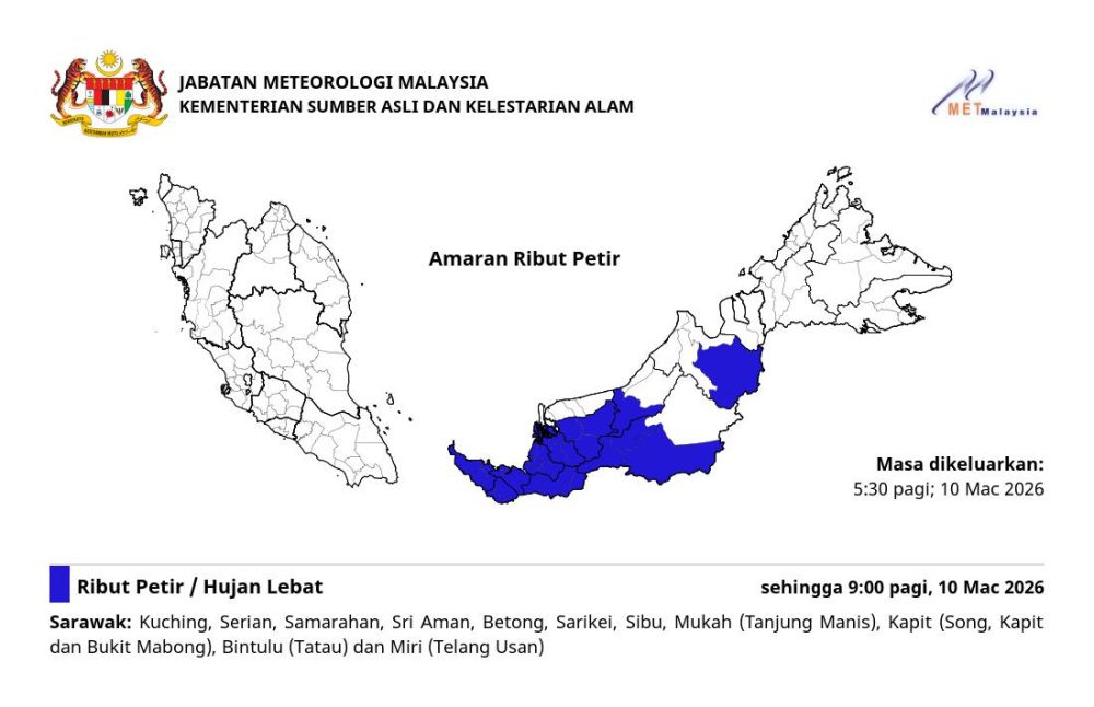 根据气象局于3月10日清晨5时30分发布的最新预警,受影响地区主要集中在砂拉越中南部及北部多个省份。气象局提醒,当地可能出现雷暴、强风及短时间内的大雨情况。