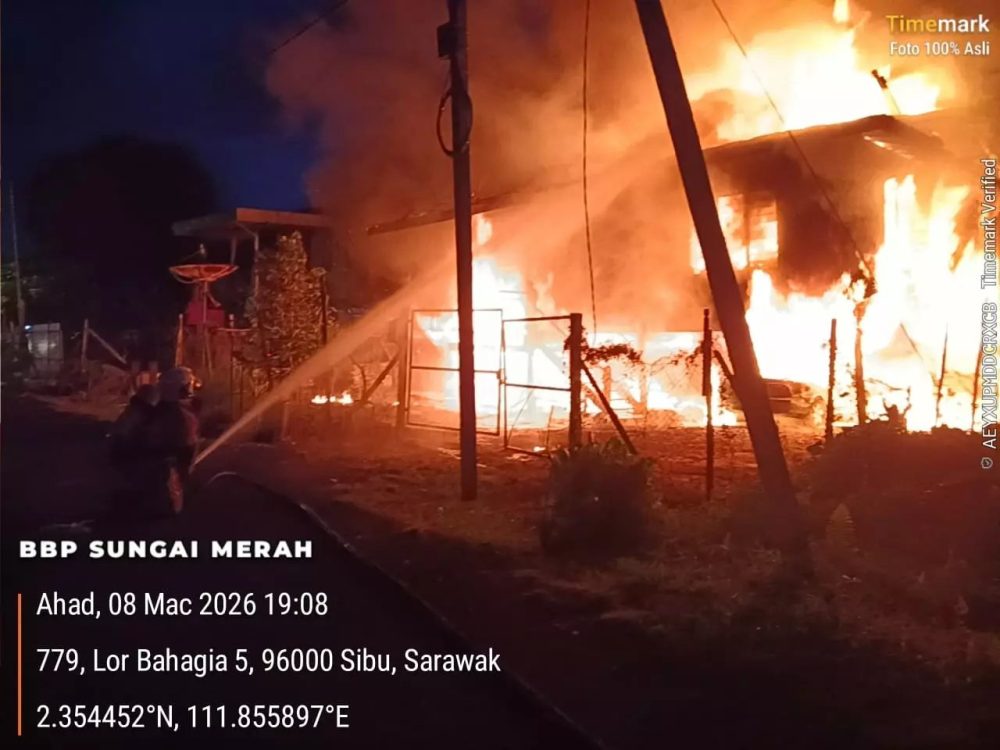 诗巫德古幸运村(Kampung Bahagia Jaya)第5巷惊传火灾,一栋高脚木屋遭熊熊烈火吞噬,瞬间化为灰烬。所幸屋主姐妹及一名12岁女童恰巧因外出接送而逃过一劫,火场并无造成人员伤亡。
