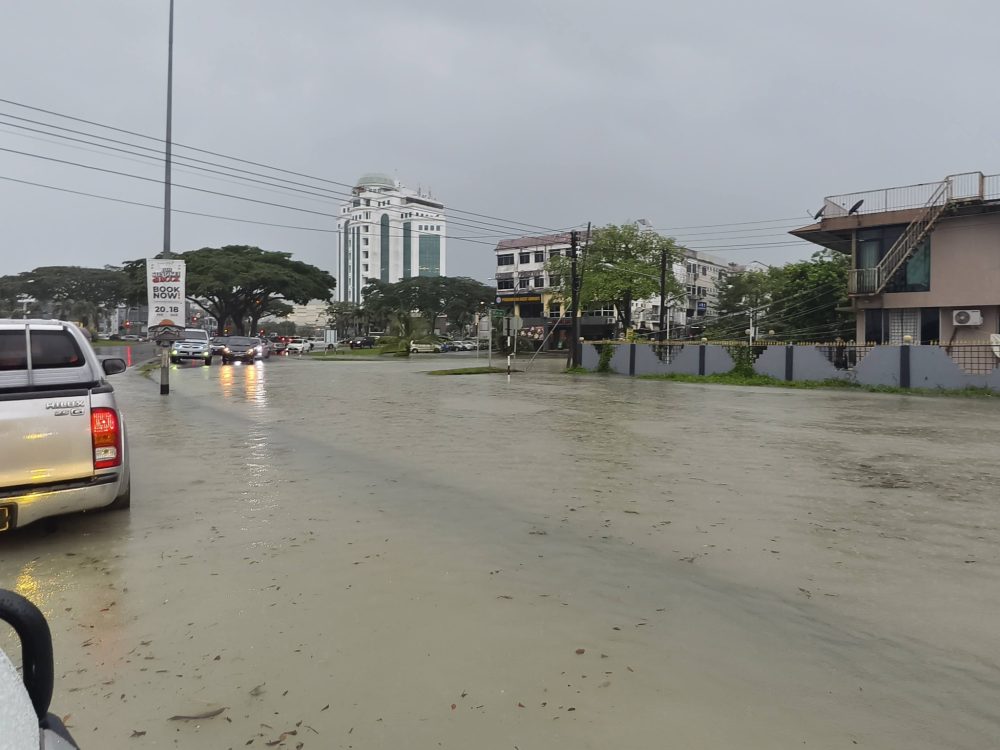 今早一场持续不断的大雨席卷古晋市区,从清晨约6时许开始降下,直到目前仍未完全停歇。尽管雨势后来有所减弱,但部分地区积水情况逐渐明显,不少路段和社区已受到影响。