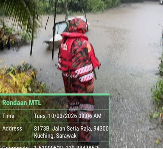 古晋今晨遭遇倾盆大雨,砂消拯局立即展开针对高风险水灾区域的巡查行动,密切监控水位变化,目前整体情况仍在可控范围内。