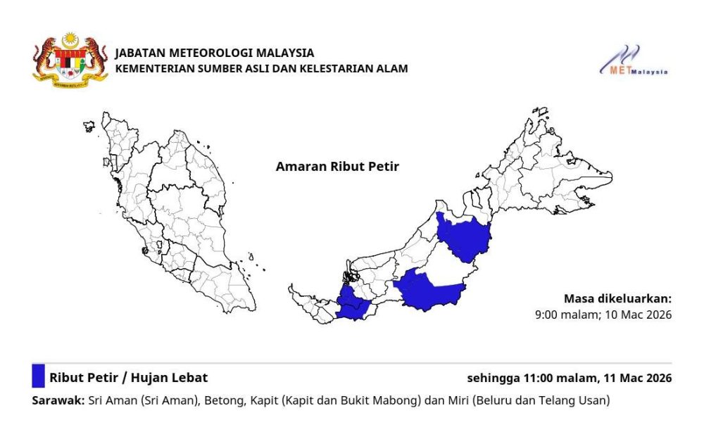 砂拉越部分地区今日晚间预计将出现雷暴、大雨及强风天气,当局已发布短期天气警报。受影响地区包括:斯里阿曼(Sri Aman)、木中(Betong)、加帛(Kapit及Bukit Mabong)以及美里(Beluru及Telang Usan),警报有效至3月11日晚上11时。