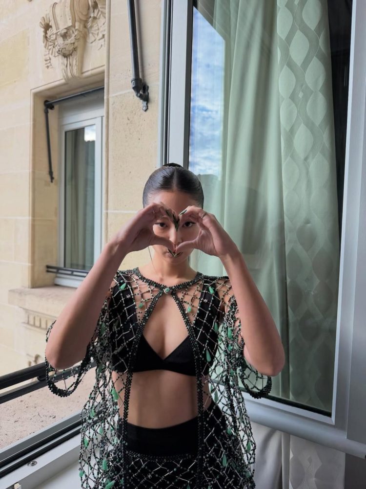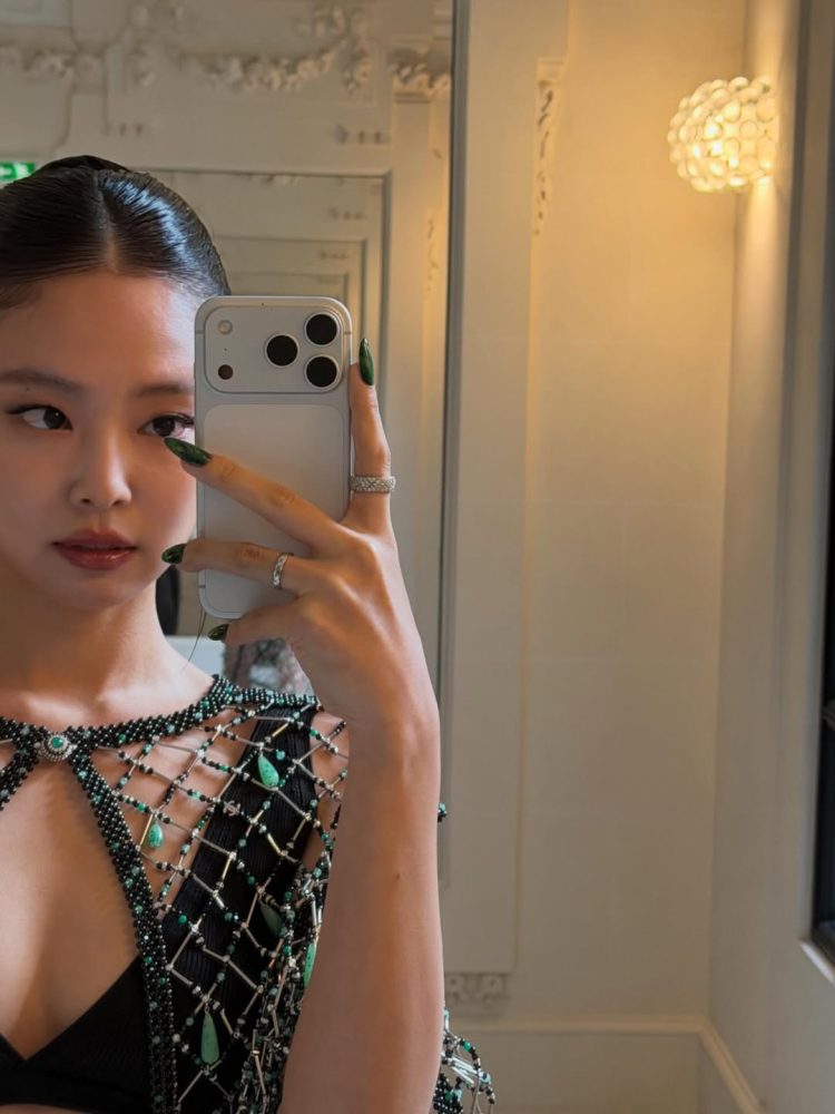 这套服装采用透视设计,并加入类似渔网的亮片元素,层次感十分鲜明。若隐若现的视觉效果让整体造型更具大胆魅力,也进一步凸显Jennie的火辣身材与独特气质。
