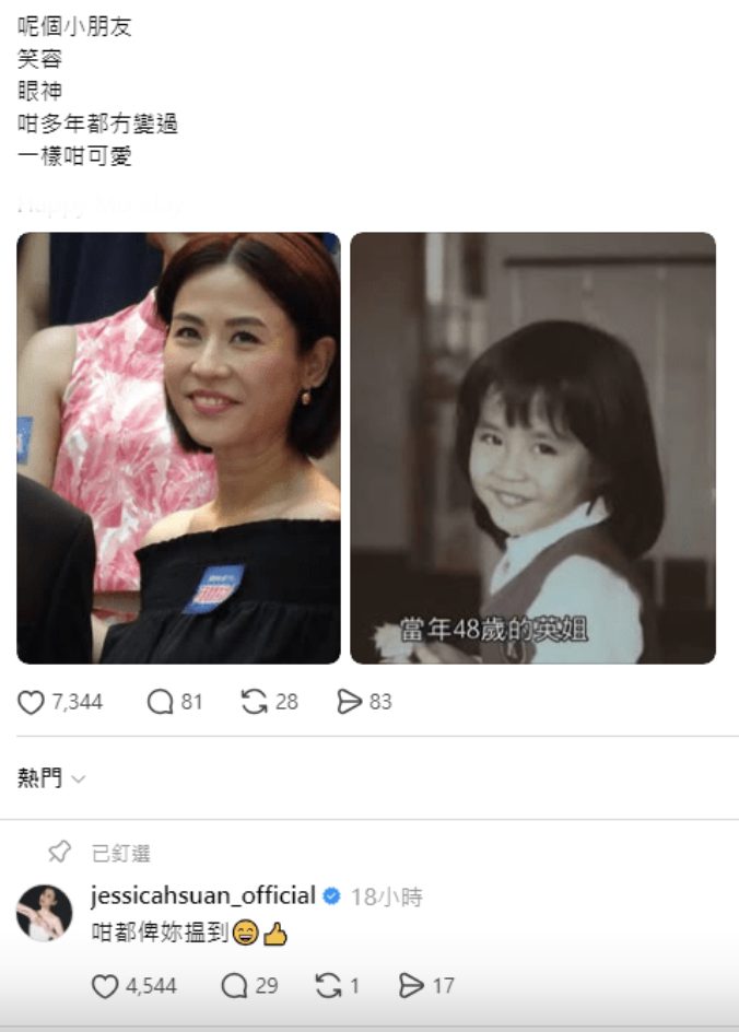 此贴文一出迅速在网络引发热议,“宣萱幼稚园旧照”瞬间成为话题焦点。宣萱本人也在留言中幽默回应:“这样都被你找到!”并配上笑脸与点赞表情,展现亲切风格。