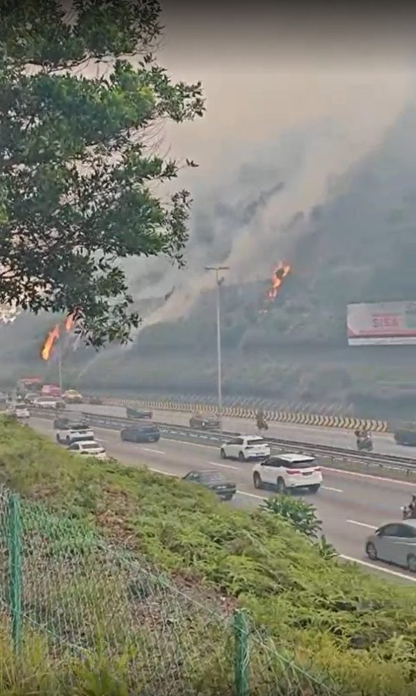 今日下午,吉隆坡隆布大道(MEX)旁的斜坡树林发生火灾,滚滚浓烟弥漫大道,影响来往车辆通行。