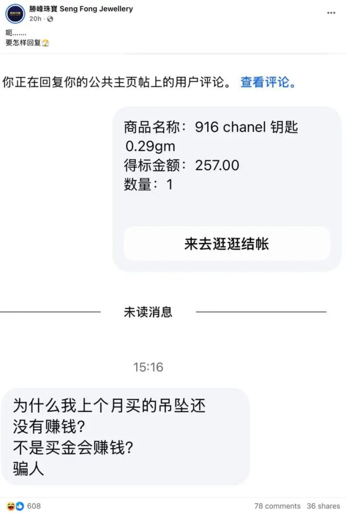 本地珠宝店「胜峰珠宝 Seng Fong Jewellery」日前在社交平台分享一则顾客询问记录。内容显示,一名顾客突然向店家发讯息,询问自己上个月购买的黄金为何到现在还没有赚到钱。这个问题也让店家一时不知如何回应。
