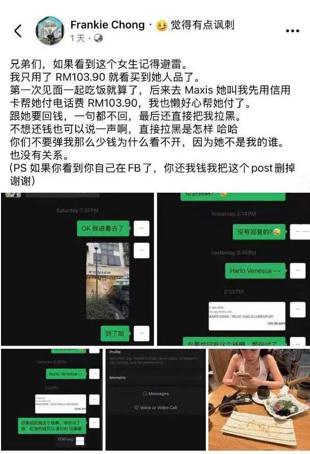 根据网传贴文,一名名为Frankie Chong的男子在Facebook发帖提醒朋友“避雷”某名女子。他表示,两人第一次见面一起吃饭,之后到Maxis办理事务时,对方要求他先垫付电话费用,总额为RM103.90。事后他向女子追讨款项却一直没有回应,最终还被对方拉黑,因此决定公开经历。
