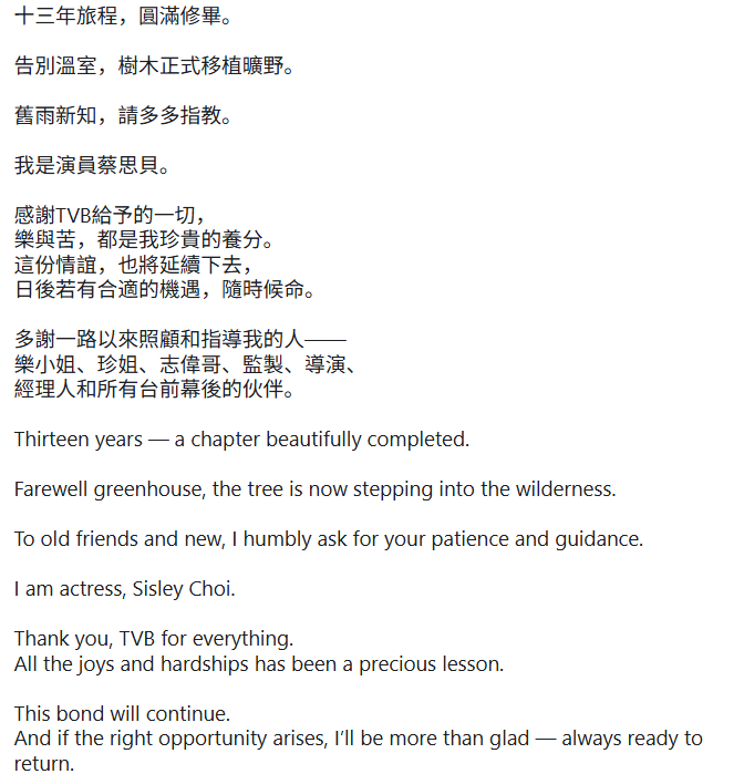 在帖文中,她感谢TVB多年来提供的机会,并表示工作中经历的顺境与挑战都成为成长养分。她也特别点名感谢多位高层、监制、导演、经理人与台前幕后同事的支持,并透露未来若有合适机会,仍乐意与旧东家再度合作。