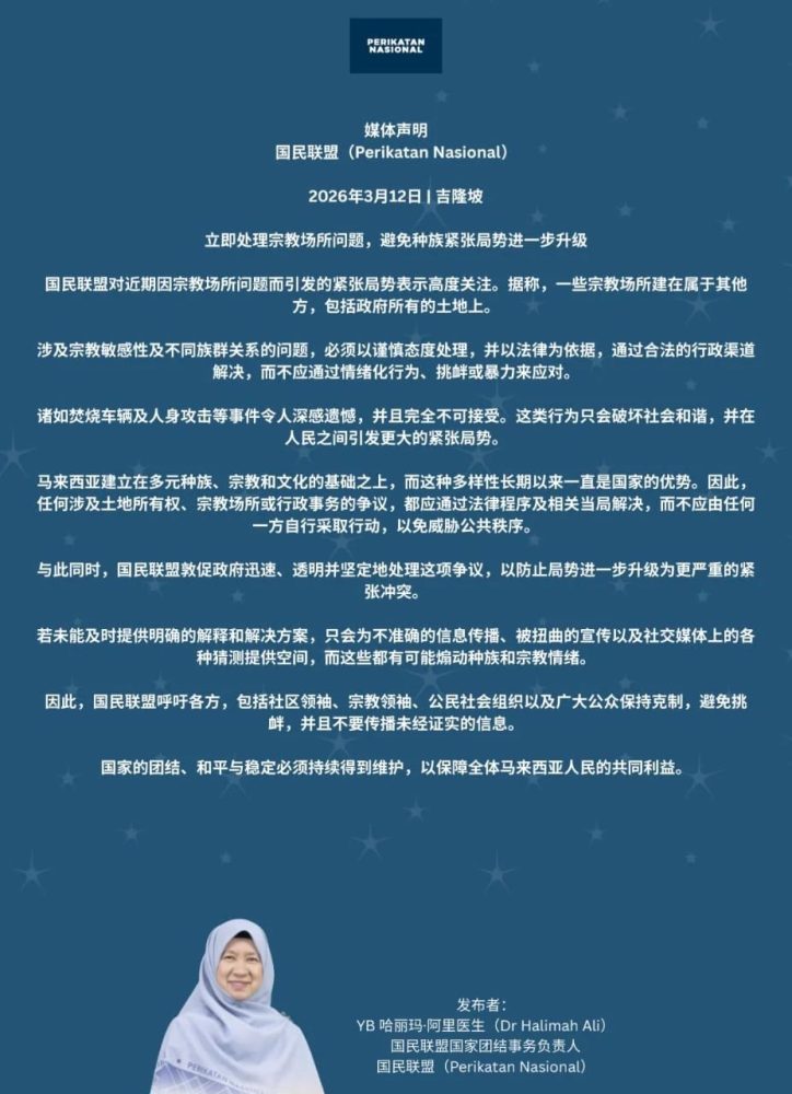 她指出,宗教课题牵动族群关系与社会互信,处理时必须格外谨慎,不能任由情绪主导,更不能让挑衅言行扩大裂痕。国盟在文告中呼吁社区领袖、宗教人士、非政府组织及民众保持冷静与克制,不传不实消息,也不要轻信未经证实的内容,共同维护社会理性与平和。