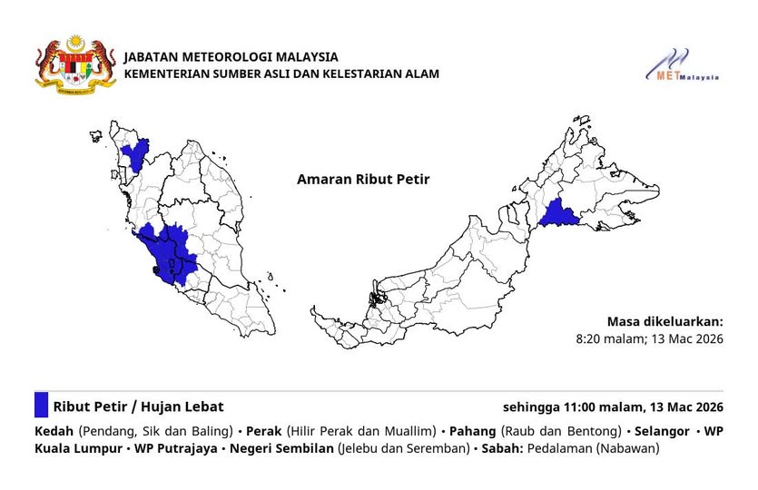 气象局周五晚间发出紧急气象预警,大马半岛多个州属及沙巴内陆地区预计迎来强风暴雨,恶劣天气将持续至今日深夜11时,民众受促提防突发水灾及交通事故。