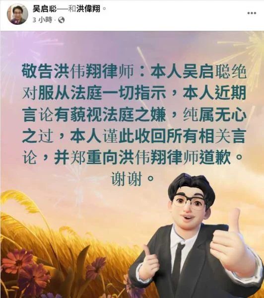 吴启聪同时也是行动党古来前市议员。他在面子书最新贴文中表示:“敬告洪伟翔律师:本人吴启聪绝对服从法庭一切指示。近期言论有藐视法庭之嫌,纯属无心之过。本人谨此收回所有相关言论,并郑重向洪伟翔律师道歉。”