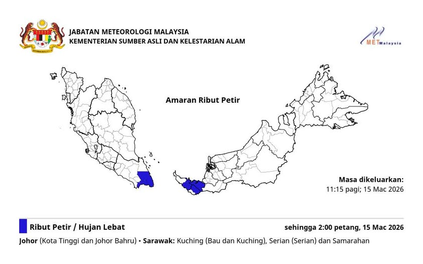 受影响地区包括柔佛州哥打丁宜及新山;砂拉越则涉及古晋省(石隆门、古晋)、西连省(西连)以及三马拉汉省,相关天气状况预计持续至2026年3月15日(星期日)下午2时。