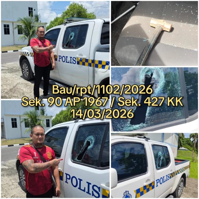 警方指出,男子于15日中午骑着摩托车从住家前往石隆门警局。抵达后,他发现警局内停放着一辆印有“Polis”字样的货卡,随即走到车子右后方,并从牛仔裤内取出铁锤,猛力敲击车窗将其砸破。