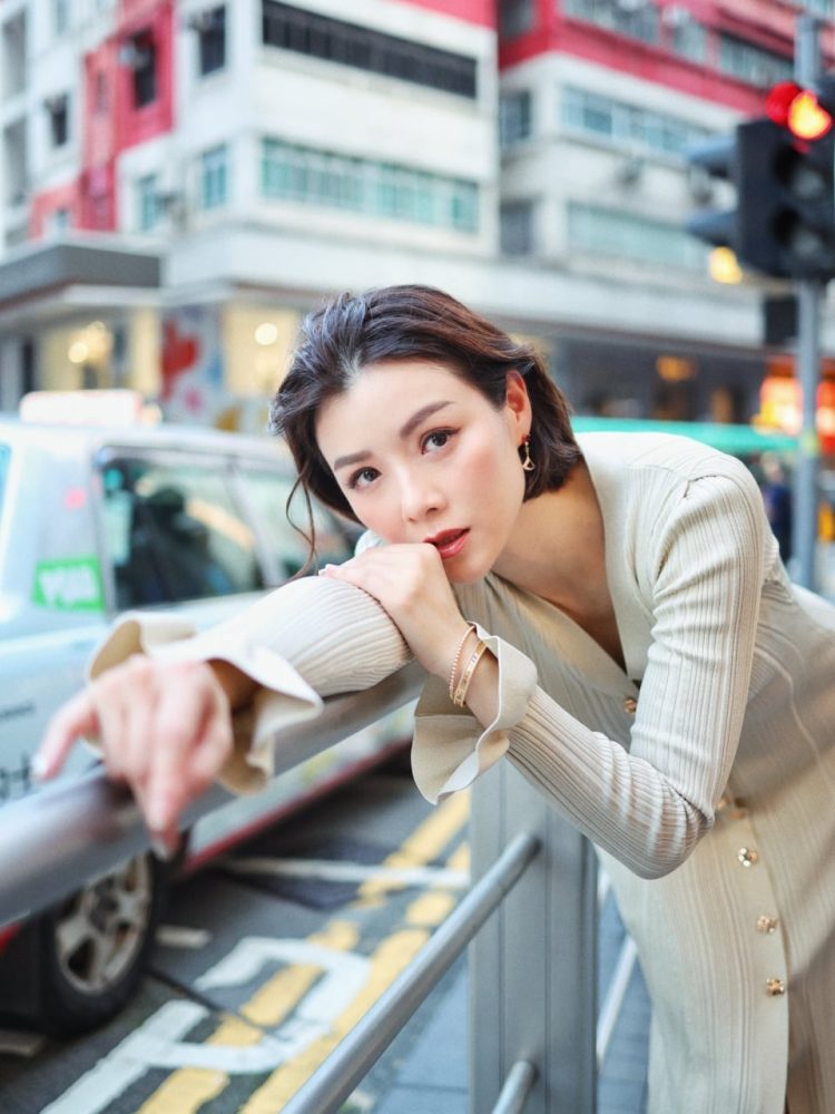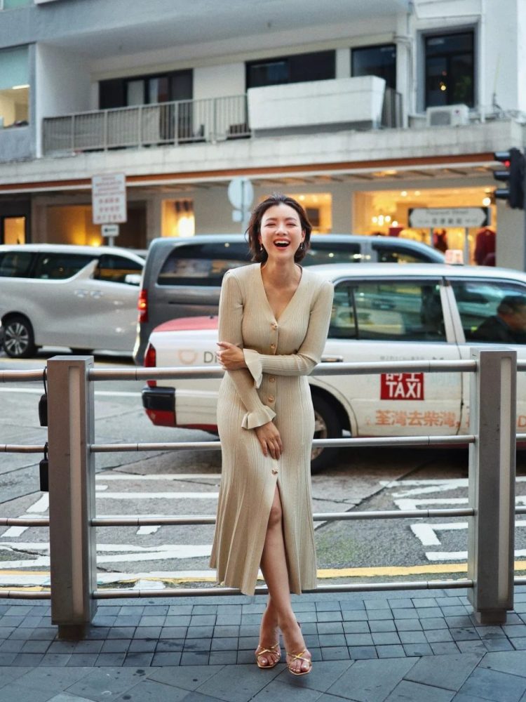 照片中,她身穿贴身长裙亮相,裙子的V领与高开衩设计展现出优雅又带点性感的风格,修长身形与曲线也十分吸睛。她站在街头栏杆旁摆出不同姿势拍照,整体气质显得自信又迷人。