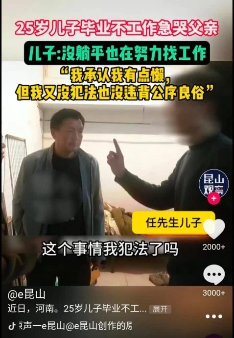 父亲在视频中苦口婆心劝儿子:“你都25岁了,总得自己养活自己啊,不能一直在家啃老,让人笑话。”然而,儿子面对父亲的崩溃反应异常冷静,甚至理直气壮地回应:“我没有犯法,也没有违背公序良俗,更没麻烦别人,凭什么批评我?”