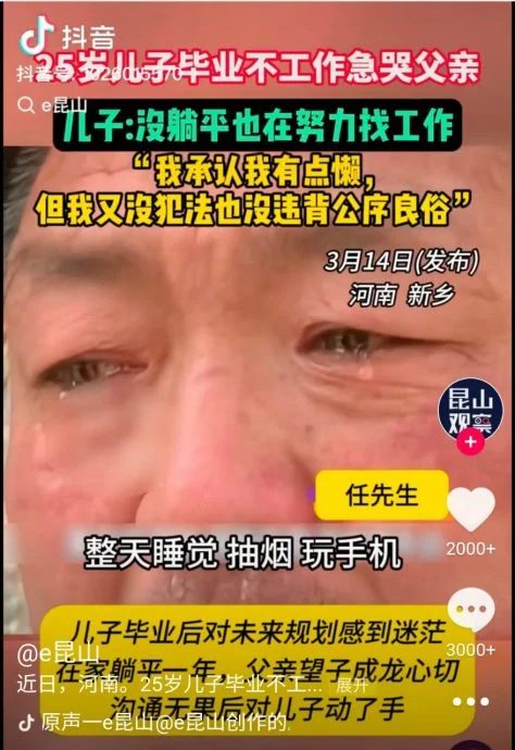 河南新乡近日一段父子冲突视频在网络疯传,引发热议。视频中,一名父亲因儿子长期待在家中“啃老”而情绪失控,在镜头前痛哭,直言无奈与心酸;然而25岁的儿子却平静反驳,认为自己既未违法,也未给他人添麻烦,不应被批评。