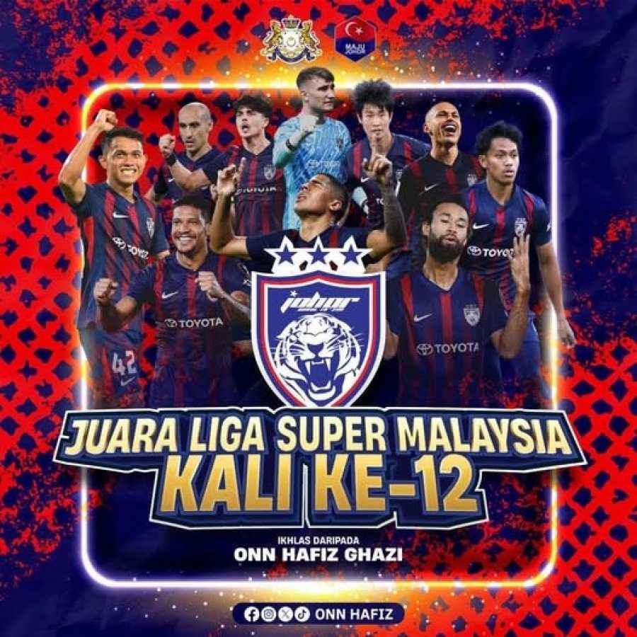 翁哈菲兹在贴文中代表柔佛人民,向柔佛达鲁塔克欣足球队连续12年问鼎超级联赛冠军表示热烈祝贺。他指出,这项成绩不仅彰显了球队的强大实力,也印证了柔佛摄政王东姑依斯迈在推动州足球转型、将柔佛打造为全国足球典范过程中所展现的卓越领导力、远见与承诺。