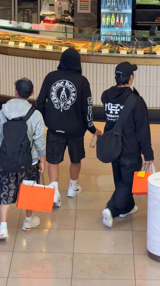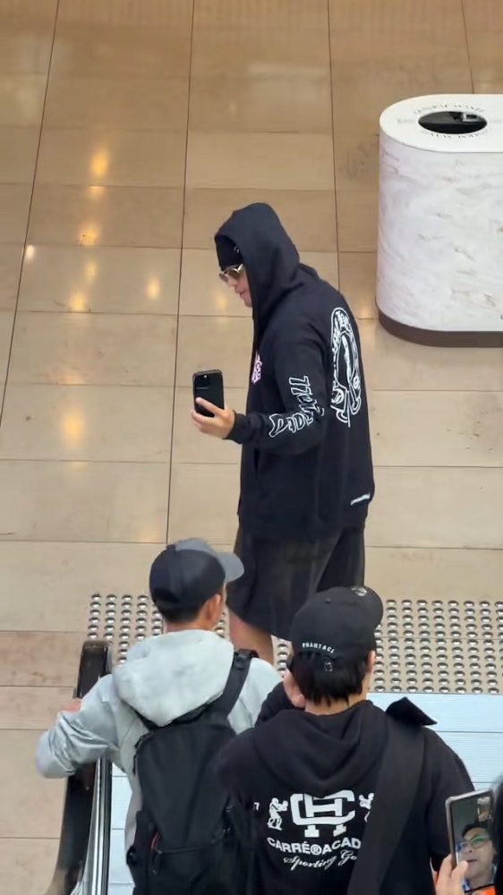 当天他一身全黑打扮,戴着墨镜、穿连帽上衣搭配短裤与运动鞋,尽管刻意低调,仍难掩明星气场,很快被认出。他手拿珍珠奶茶,与友人边走边聊,神情轻松。