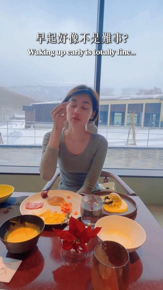她在社交平台上传一段在酒店用早餐的片段,笑称只要有早餐就会提早起床。影片中,她身穿灰色T恤,从排队取餐到坐下用餐,全程一副睡眼惺忪的模样,状态自然放松。