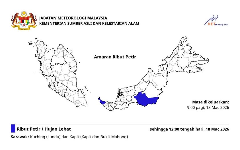 根据当局在3月18日发布的最新气象预测,这股不稳定的气流将持续影响砂州中部及南部部分县区,恶劣天气预计一直维持到周三中午12时。