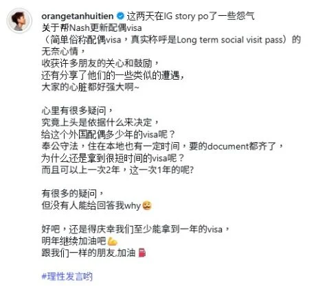 她在社交平台发文分享经历,透露这次协助丈夫更新长期社交访问准证的过程中,心中充满不解,尤其不清楚当局究竟依据哪些标准来决定外籍配偶可获批的签证年限。