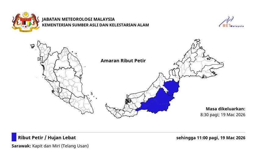 气象局发出最新气象预警,砂拉越内陆局部地区受雷暴影响,恶劣天气预计将持续至今日上午11时。