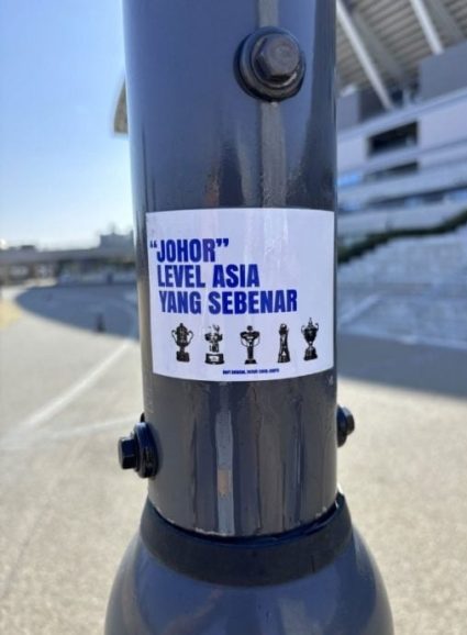 这起风波源自一名日本网民的发文。他上传的照片显示,体育场一根柱子上被贴上一张写有“柔佛,真正的亚洲水准”的贴纸,图案中还附有奖杯设计,疑似与马来西亚球迷有关。