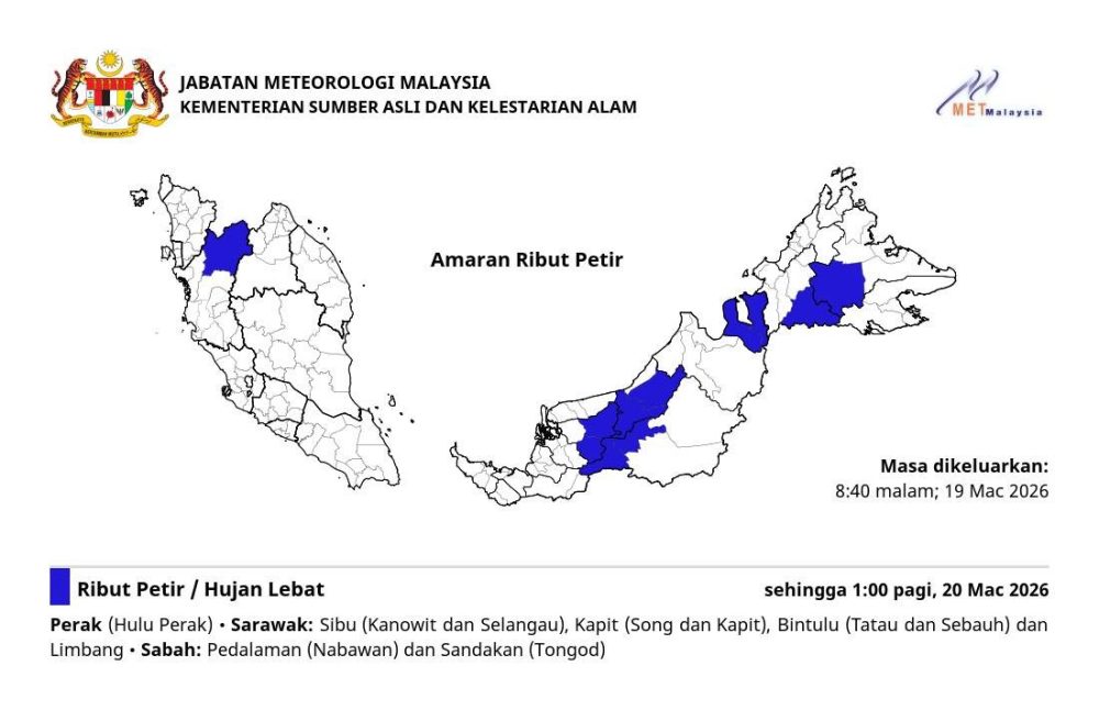 气象部门发布短时天气警报,预计多个地区将出现雷雨、强降雨及强风天气,情况持续至2026年3月20日(星期五)凌晨1时。