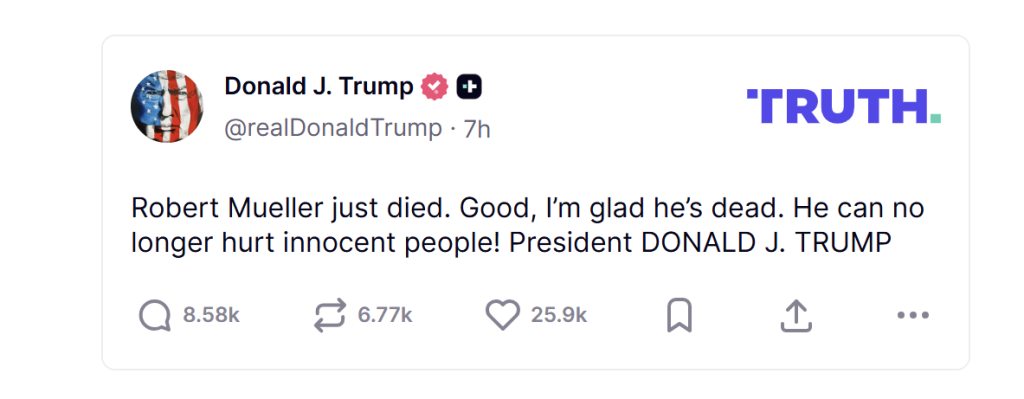 特朗普随即在Truth Social发文写道:“穆勒刚过世了。很好,我很高兴他死了。他再也无法伤害无辜的人!”