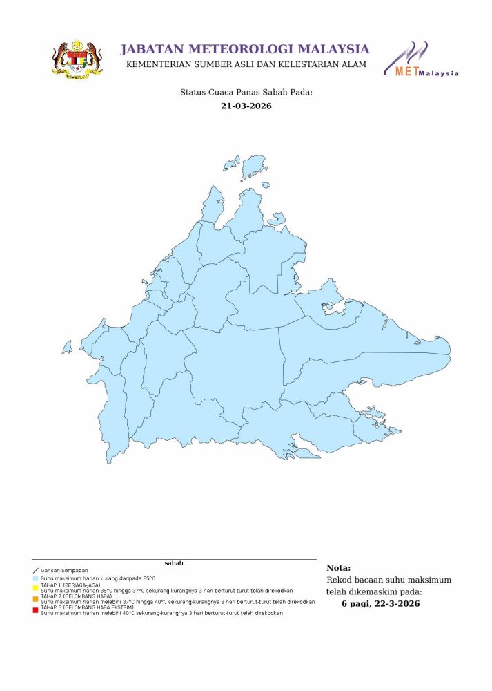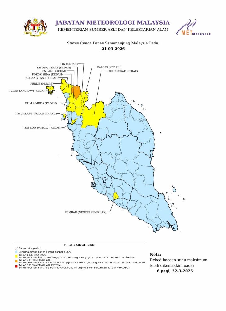 大马气象局今日对吉打巴东得腊发出第二级热浪警报,显示当地已进入较高风险的炎热天气状态。