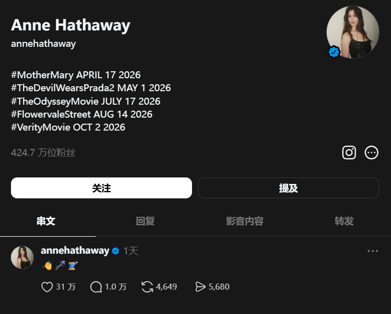 好莱坞影星安妮海瑟薇近日进驻社交平台Threads,首度发文便迅速掀起热潮,短时间内吸引超过22万名用户点赞与留言,话题持续延烧。
