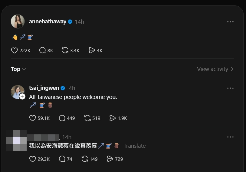 台湾前总统蔡英文也现身留言区,以“所有台湾人都欢迎你”表达欢迎之意,并配上“针、线、木头”的表情符号,借用谐音梗传达“真羡慕”,结合时下网络用语,引来大量关注与转发。