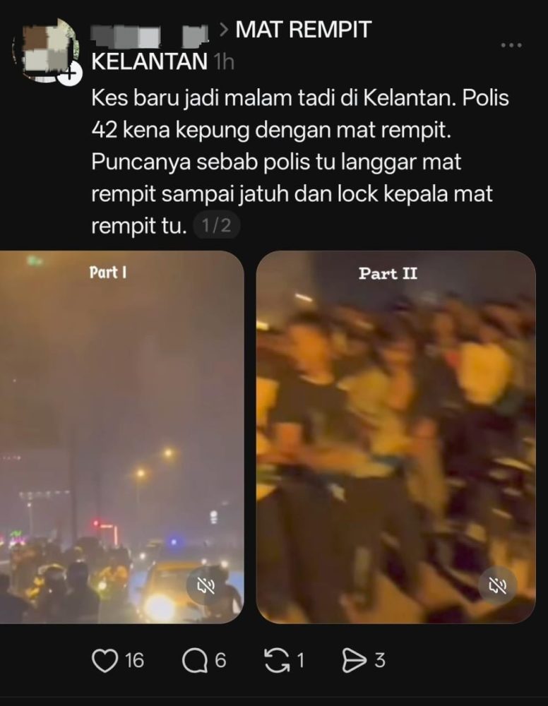 瓜拉吉赖开斋节深夜执法行动演变成冲突事件,警方证实,一名摩哆骑士在逃避检查时发生碰撞倒地,警员上前逮捕时遭人打伤,现场随后有民众聚集干扰执法、出言挑衅,相关画面在社交媒体广泛流传后,引发关注。警方目前已援引刑事法典展开调查,并追查其他涉案者及车辆下落。