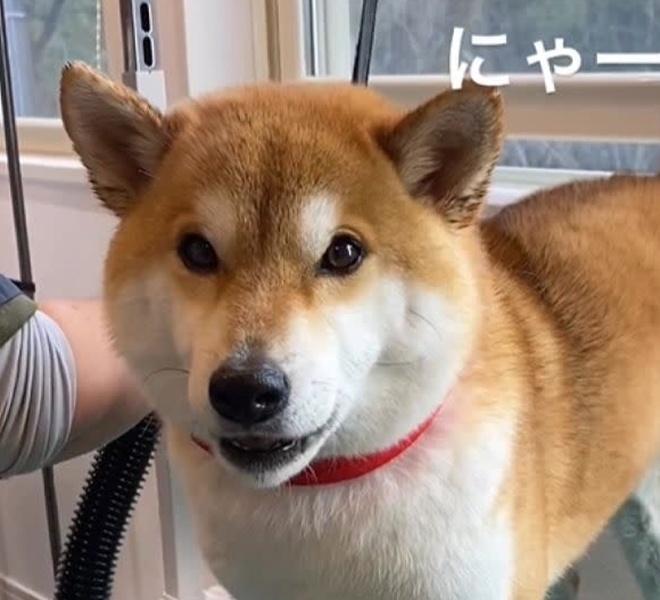 公柴犬「定春」今年五岁,但对吹风机轰隆隆的声音依旧毫无招架之力。
