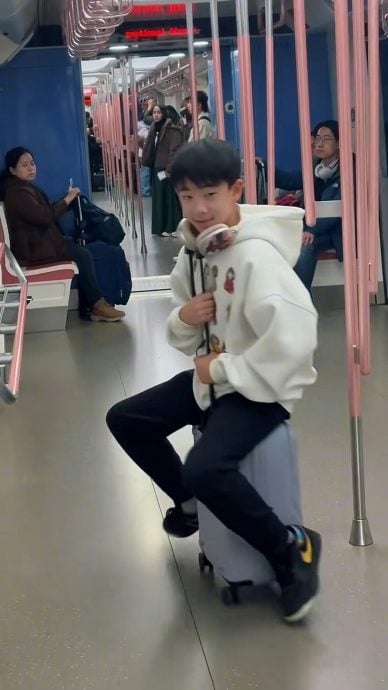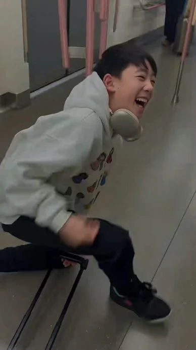 不过,上车后Jasper的一举动成为讨论焦点。他坐在行李箱上,在车厢内滑行玩乐,期间一度失去平衡向前跌倒,但仍笑得十分开心。应采儿全程仅在一旁拍摄,并未出手制止。