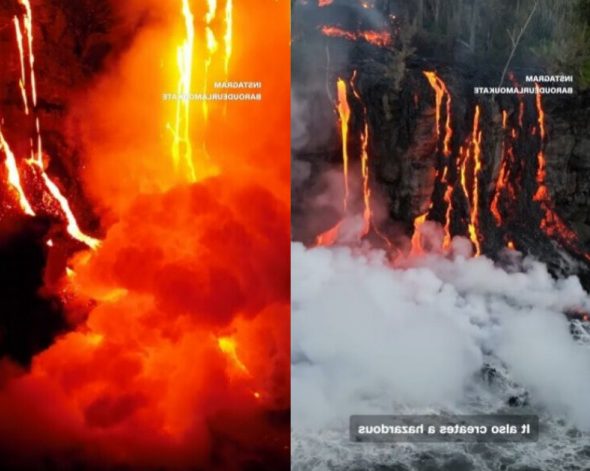 从空中拍摄的画面可见,橙红色熔岩越过岸边后直接注入海水,蒸汽与烟雾随即升起,形成强烈的视觉冲击。不过,这场自然奇观背后也伴随新的危险。官方指出,熔岩进入海中后会迅速冷却并堆积,逐步生成所谓“熔岩三角洲”,但这类新地表结构并不稳固,随时可能塌陷或出现突发爆裂。