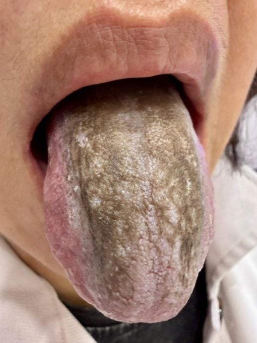 他分享一宗临床案例指出,一名妇人因牙周问题频繁使用强效漱口水,一天多达五六次,结果舌头表面的乳头受损,最终出现厚重灰褐色苔状物,被诊断为“黑毛舌”。